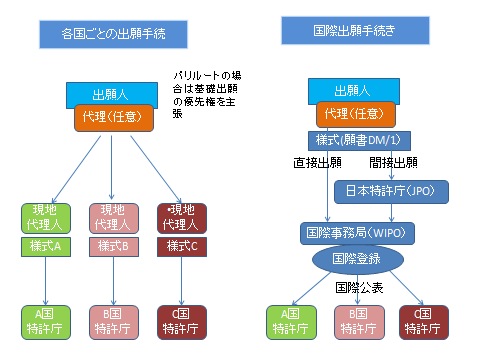 国際出願は、国際事務局(WIPO)に対して直接行うことも(直接出願)、日本の特許庁を経由して行うことも(間接出願)できます。