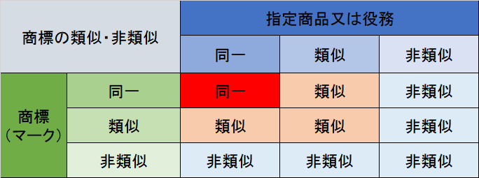 したがって、商標が類似しているかは、①商標(マーク)が類似しているかと②商品やサービスが類似しているかを判断する必要があります。これを図で表すと下図のようになります。